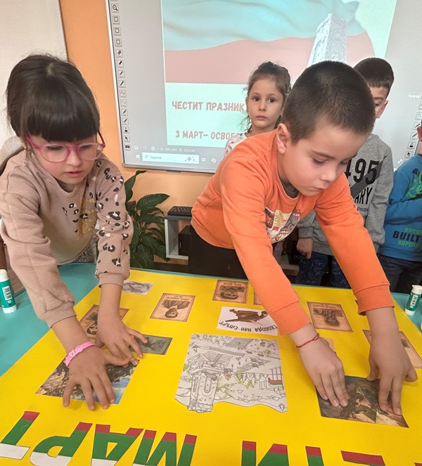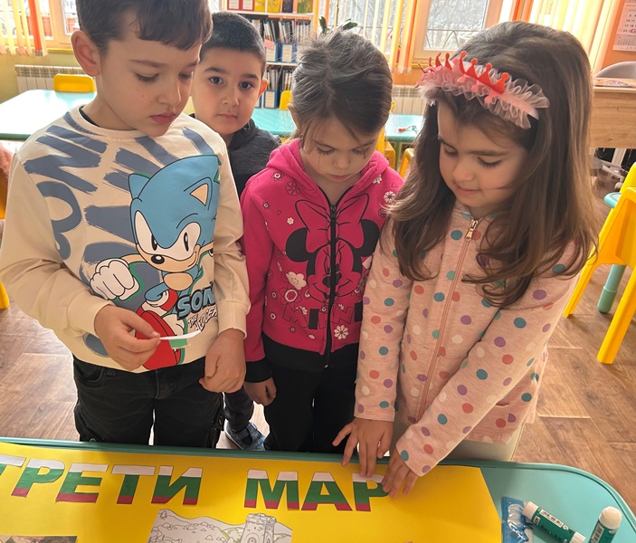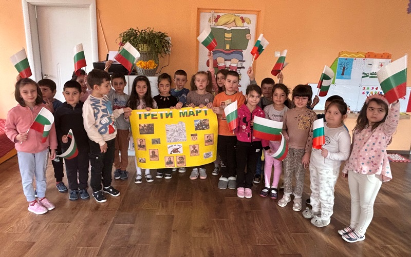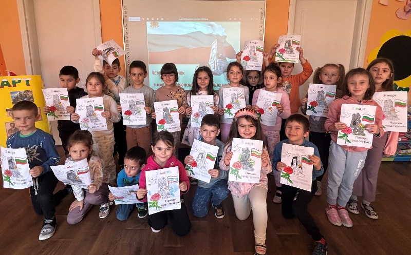 На 3 март 2025 година се навършват 147 години от освобождението на България. Всяка година на този ден страната ни чества своя национален празник. По този повод децата от група „Звънче“ и техните учители в екипна работа изработиха тематично табло, слушаха химна на страната ни и оцветиха тематична картина с паметника Шипка. Припомниха си за важните исторически събития свързани с предстоящия празник и за великите български личности допринесли за Освобождението на родината ни.