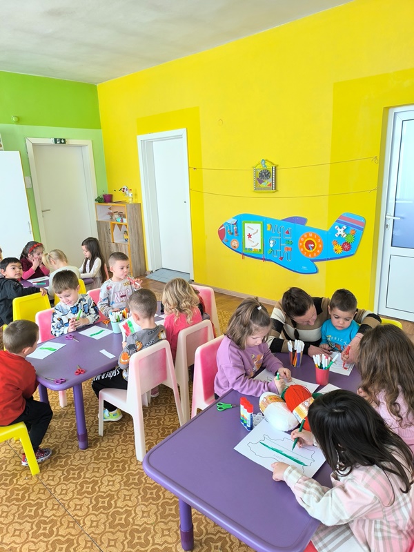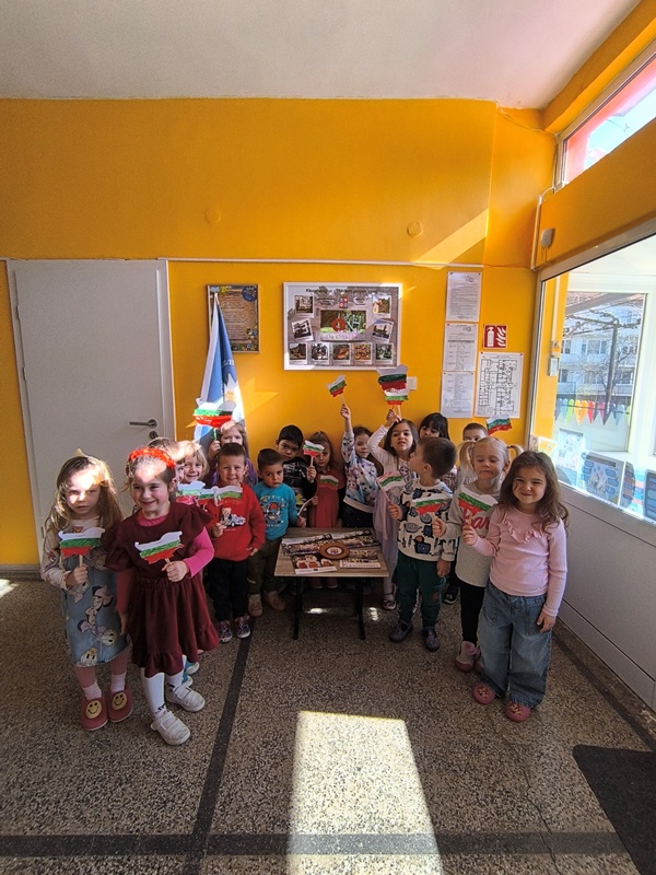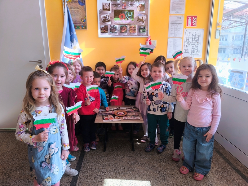 Децата от група „КАТЕРИЧКА“ със съдействието и помощта на своите учители оцветиха и украсиха с прежда трибагреника и картата на Република България. Слушаха химна на страната ни. Припомниха си за важните исторически събития свързани с предстоящия празник и за великите български личности допринесли за Освобождението на родината ни.