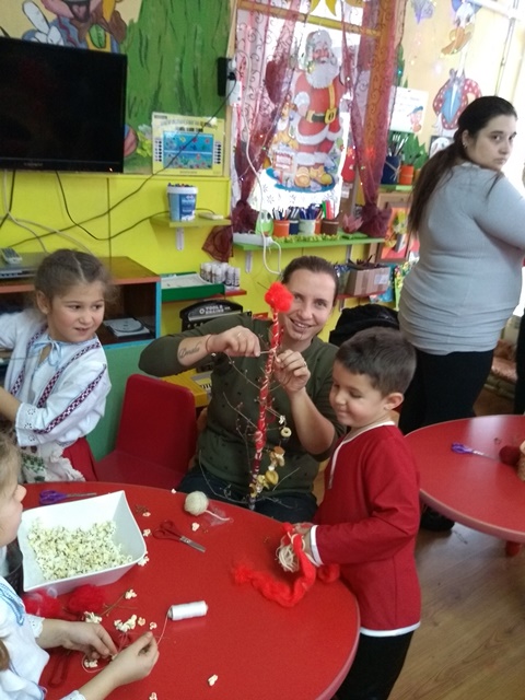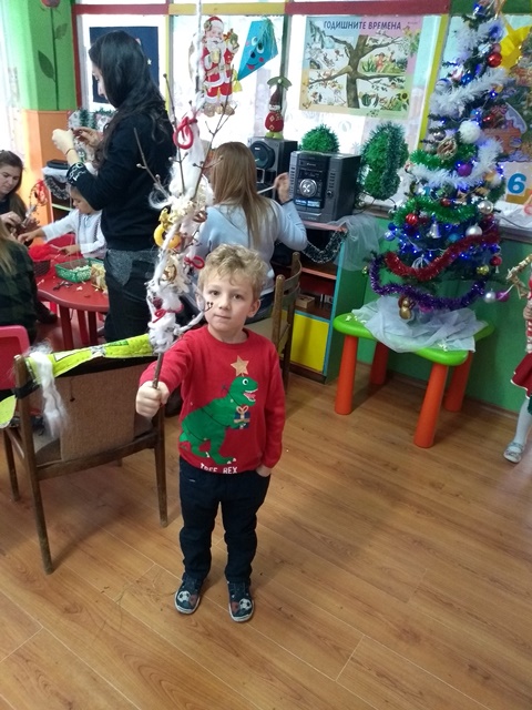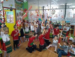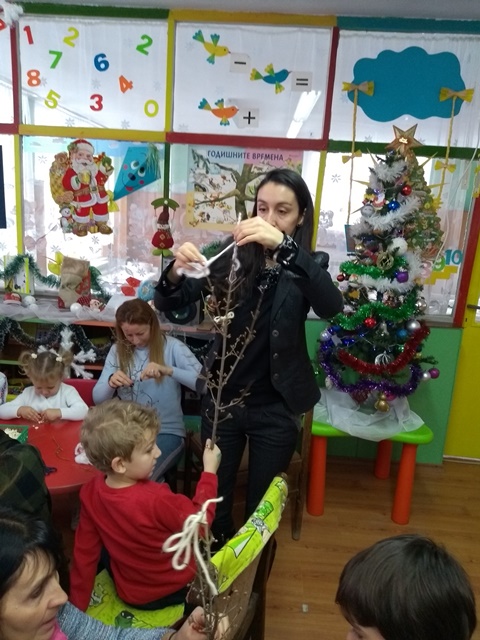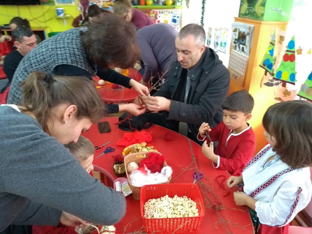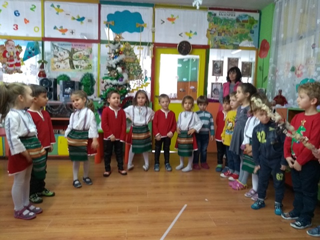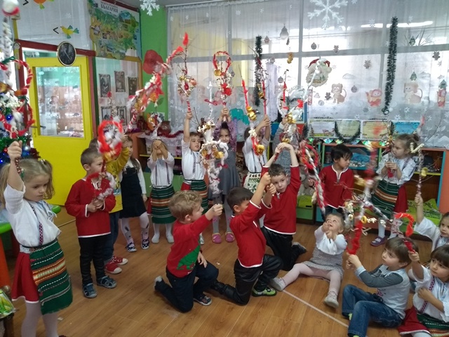 Децата поздравиха директорката г-жа М. Атанасова,  родители и учители с кратка музикална програма,  включваща танци, песни и стихотворения. След това учителките раздадоха дрянови клончета и подробно обясниха какво е сурвачка, как се украсява и каква символика има всичко, което се слага по нея. Децата заедно със своите родители украсиха сурвачките с традиционна украса от естествени материали. Бързо развихриха въображението си и декорираха пръчките със сушени плодове, пуканки, бял и червен конец.