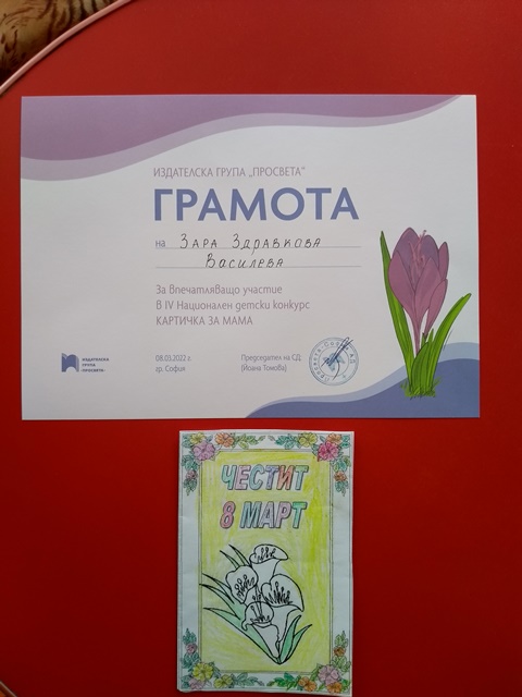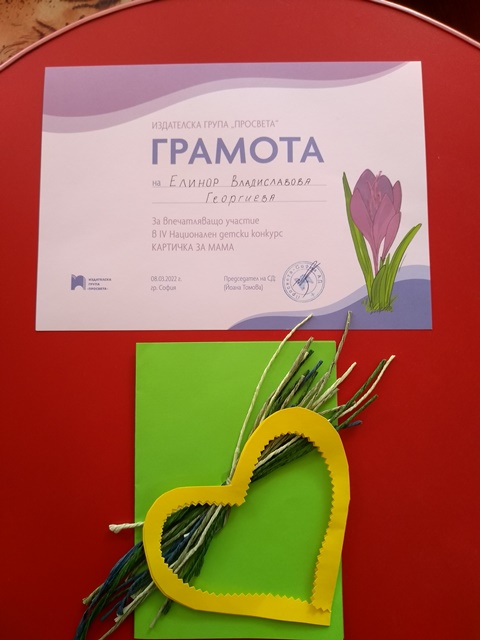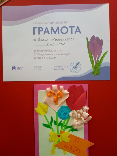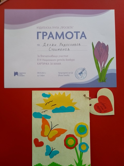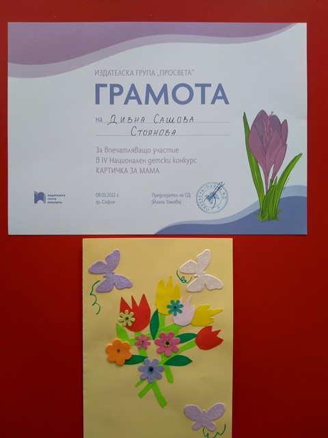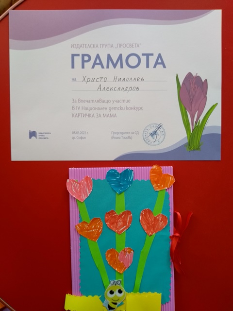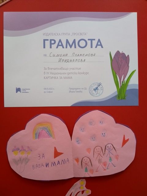 Днес, 30.03.2022 г. издателска група "Просвета" връчи грамоти за впечатляващо участие в четвърти Национален детски конкурс "Картичка за мама" на следните участници от група "Зайче":