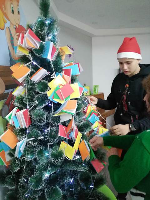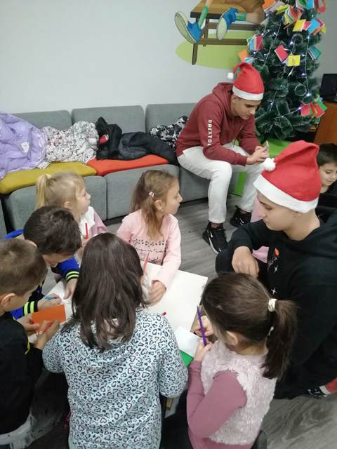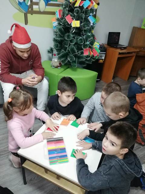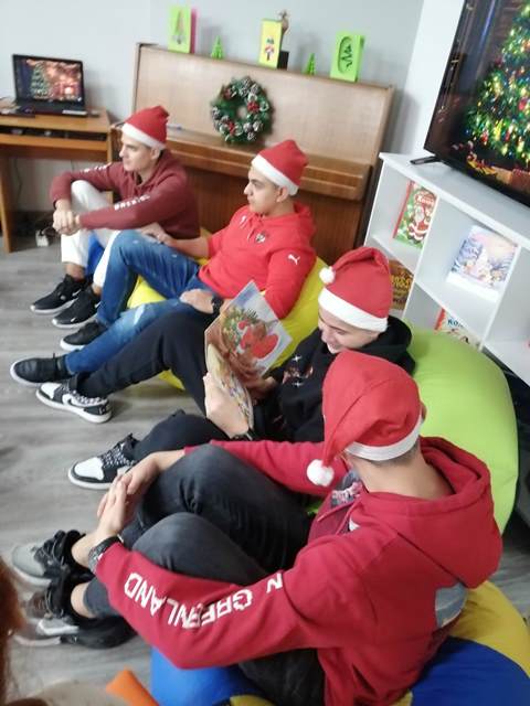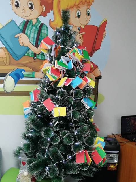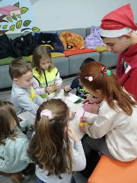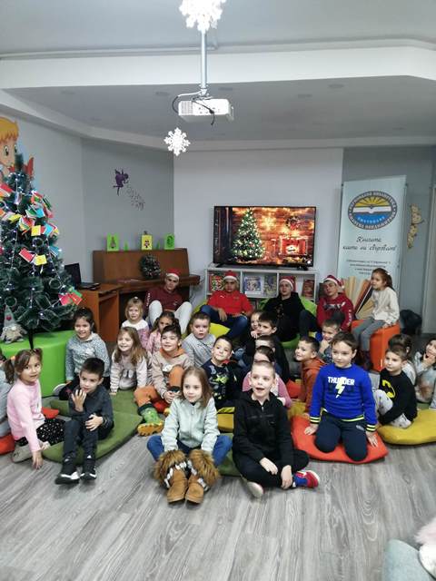 Малките „звънчета“ заедно с учениците изработиха книжки - украси и украсиха библиотечната елха. Всяко дете с огромно желание изрисува и изпълни белите листи на своята книжка. Учениците прочетоха коледни приказки,  а в знак на благодарност децата от групата ги поздравиха с коледно стихотворение.