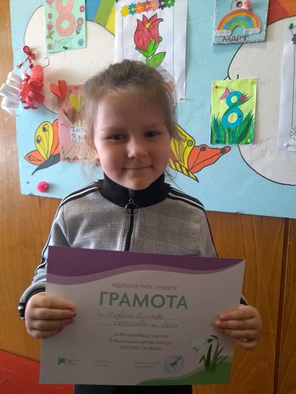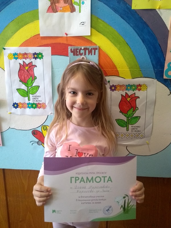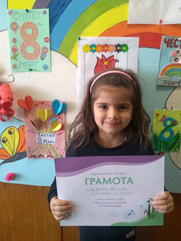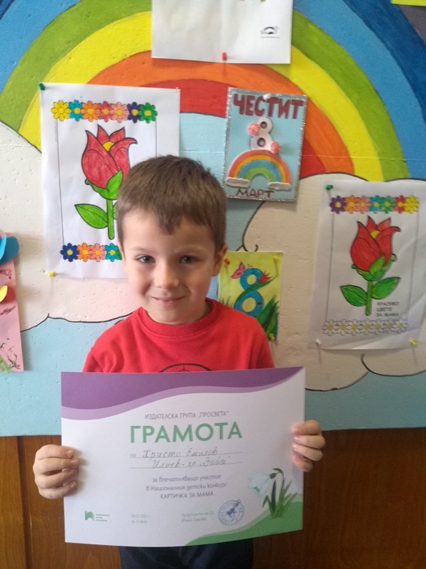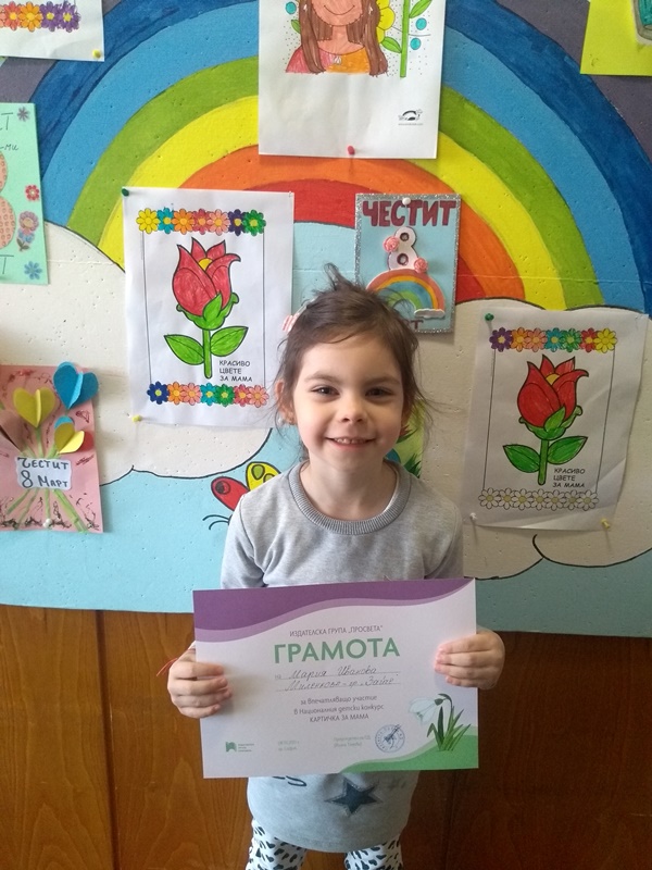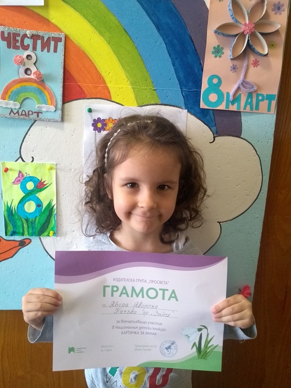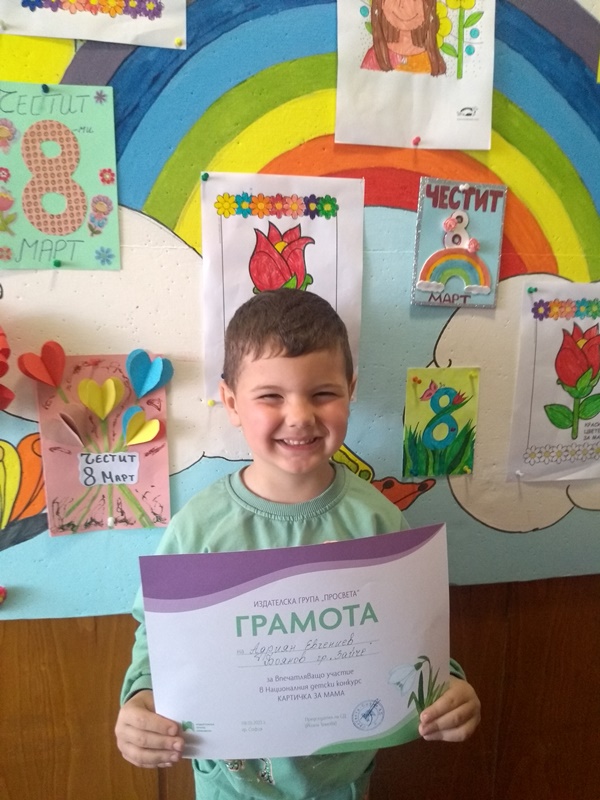 За поредна година малките творци от група "Зайче" се включиха в Националния детски конкурс КАРТИЧКА ЗА МАМА - 2023. Мария Миленкова, Изабела Георгиева, Йоана Кирилова, Радостин Георгиев, Адриян Боянов, Христо Илиев, Явора Начева, Стефания Христова и Радост Харалампиева получиха грамоти за впечатляващо участие от издателска група "Просвета".